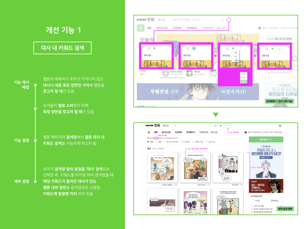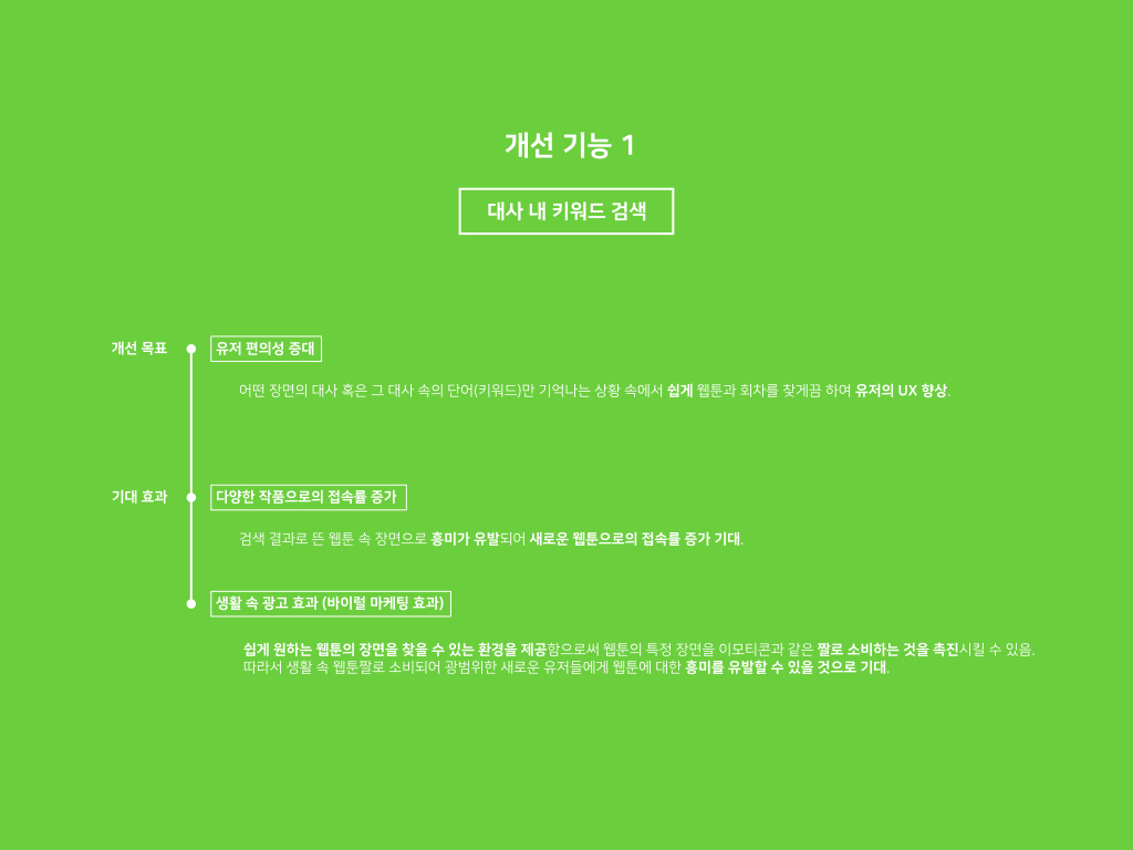 - 첫 번째 제안의 경우 기능 제시 배경이 좀 더 고객의 소리나 통계, 타사 레퍼런스 등을 통해 근거가 더해졌으면 좋았을 것 같습니다. 실제로 '이 짤이 나오는 웹툰'을 검색한 사람들의 지식in 포스트 개수라던지, SNS 상에서 짤만 보고 웹툰을 찾는 사람들의 수가 어느 정도 높다던지 하는 수치가 있었다면 좀 더 개선 이유를 설득하기 용이했을 듯 합니다.