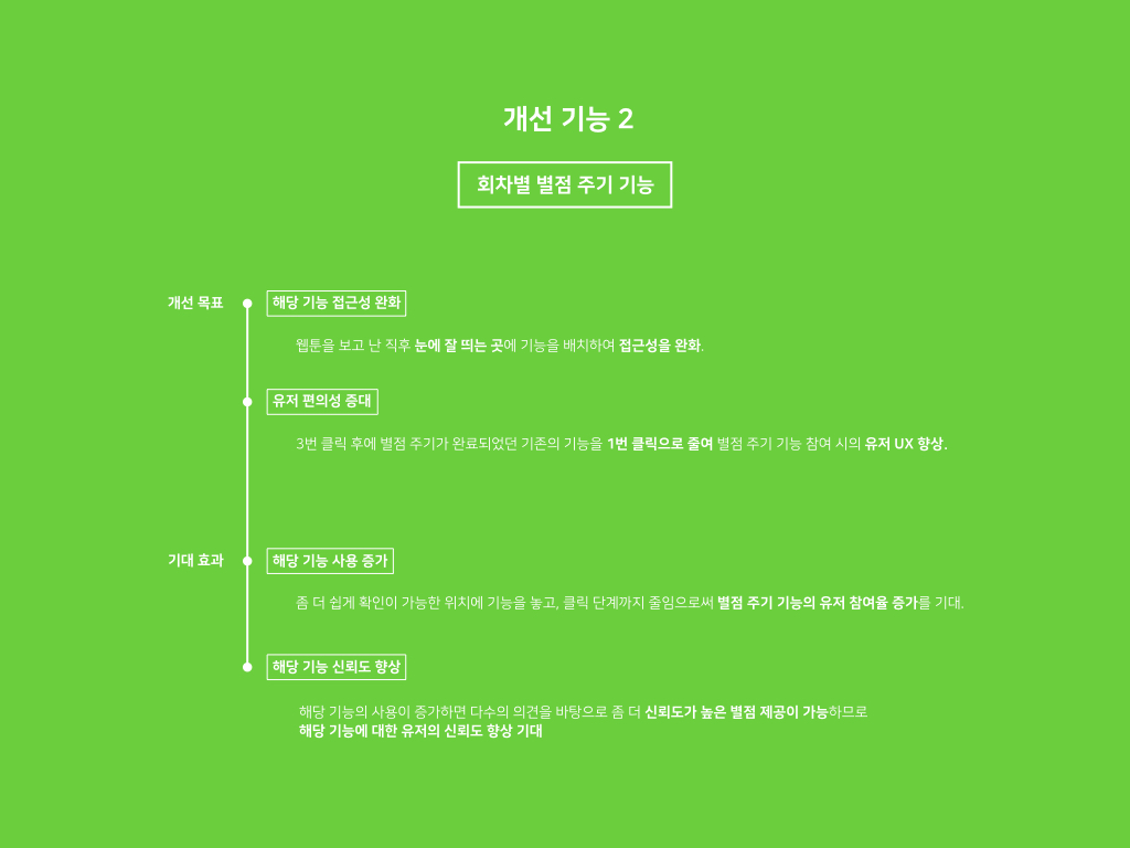 - 두 번째 제안의 경우 별점 기능을 사용하는 사람들이 많아지는 것이, 서비스 입장에서 어떻게 긍정적으로 작용할지에 대한 내용을 추가해주셨으면 좋았을 것 같습니다. 예를 들어 별점이 많은 웹툰일 수록 완결 후 결제권 판매량이 높다던지, 첫 에피소드의 별점 개수에 따라 이후 에피소드의 유져 수가 상승하기 때문에. 이번 기능 개선을 통해 결제로 이어지는 웹툰이 늘어날 것이다 혹은 첫 화를 보고 두번째 화로 이어지는 유져들이 많아서 서비스 잔존율이 높아질 것이다 등의 구체적인 효과가 있었다면 설득력이 더해졌을 것 같습니다.